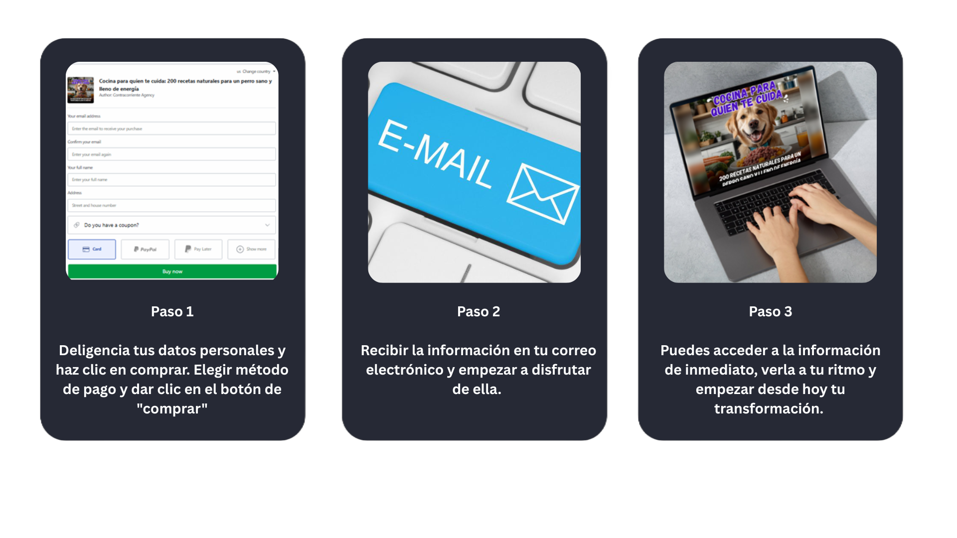 Las recetas están pensadas para personas reales, con rutinas ajustadas. Son simples, rápidas y permiten preparar varias porciones con anticipación. Además, con el bono #8: Plan Semanal de Alimentación Canina, organizar las comidas se vuelve mucho más manejable.